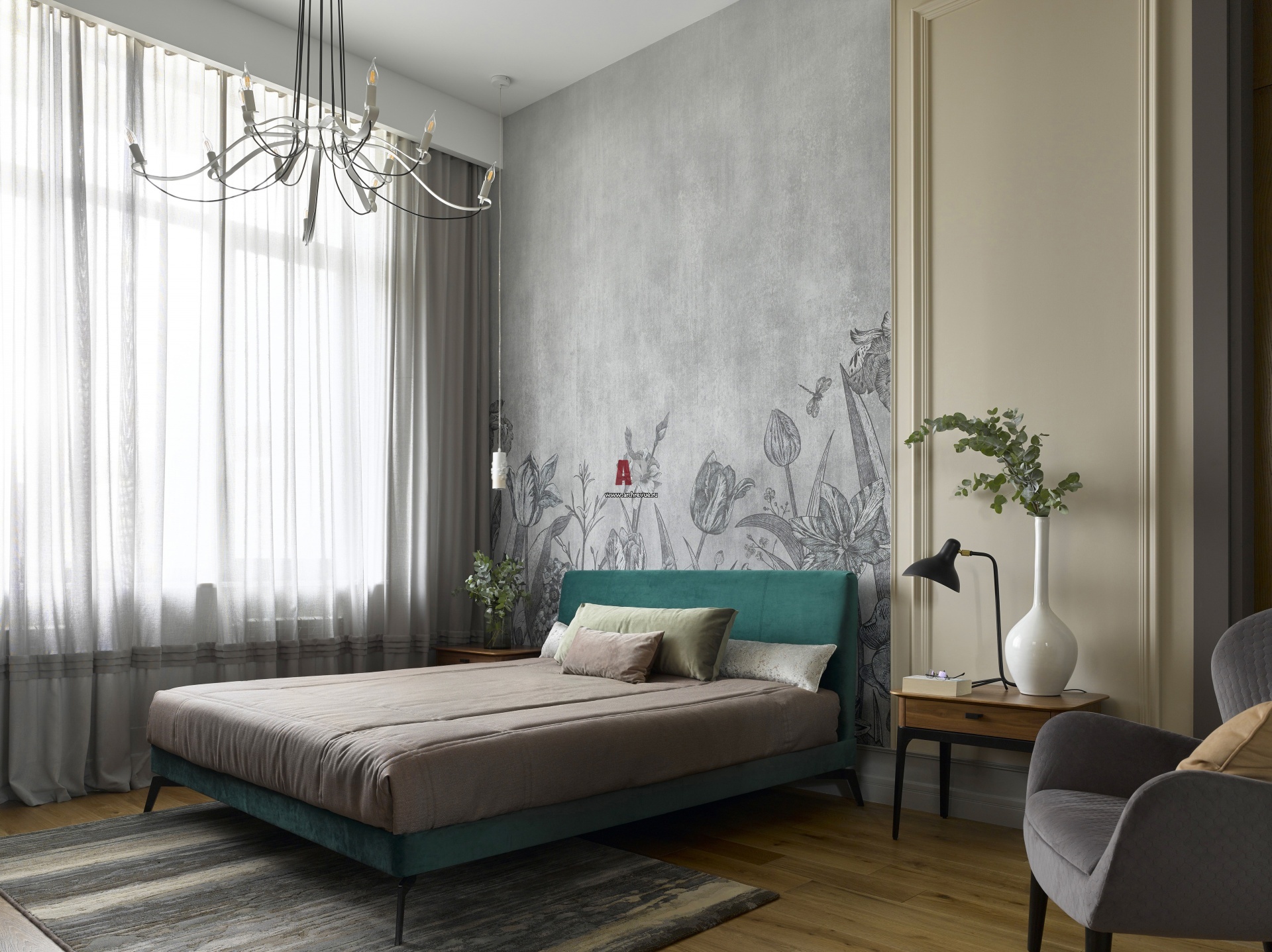 Эклектичная квартира с видом на горы. Гостевая спальня. Обои с растительным узором, Affresco. Кровать, тумбы, кресло, Furman.