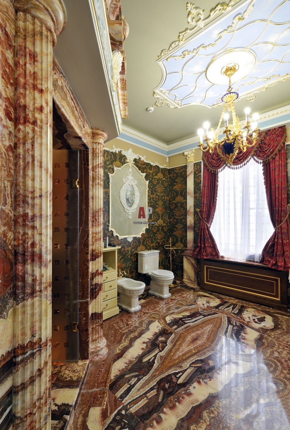Стены и пол ванной комнаты выложены красным мрамором. Сантехника, Devon & Devon, Villeroy & Boch.