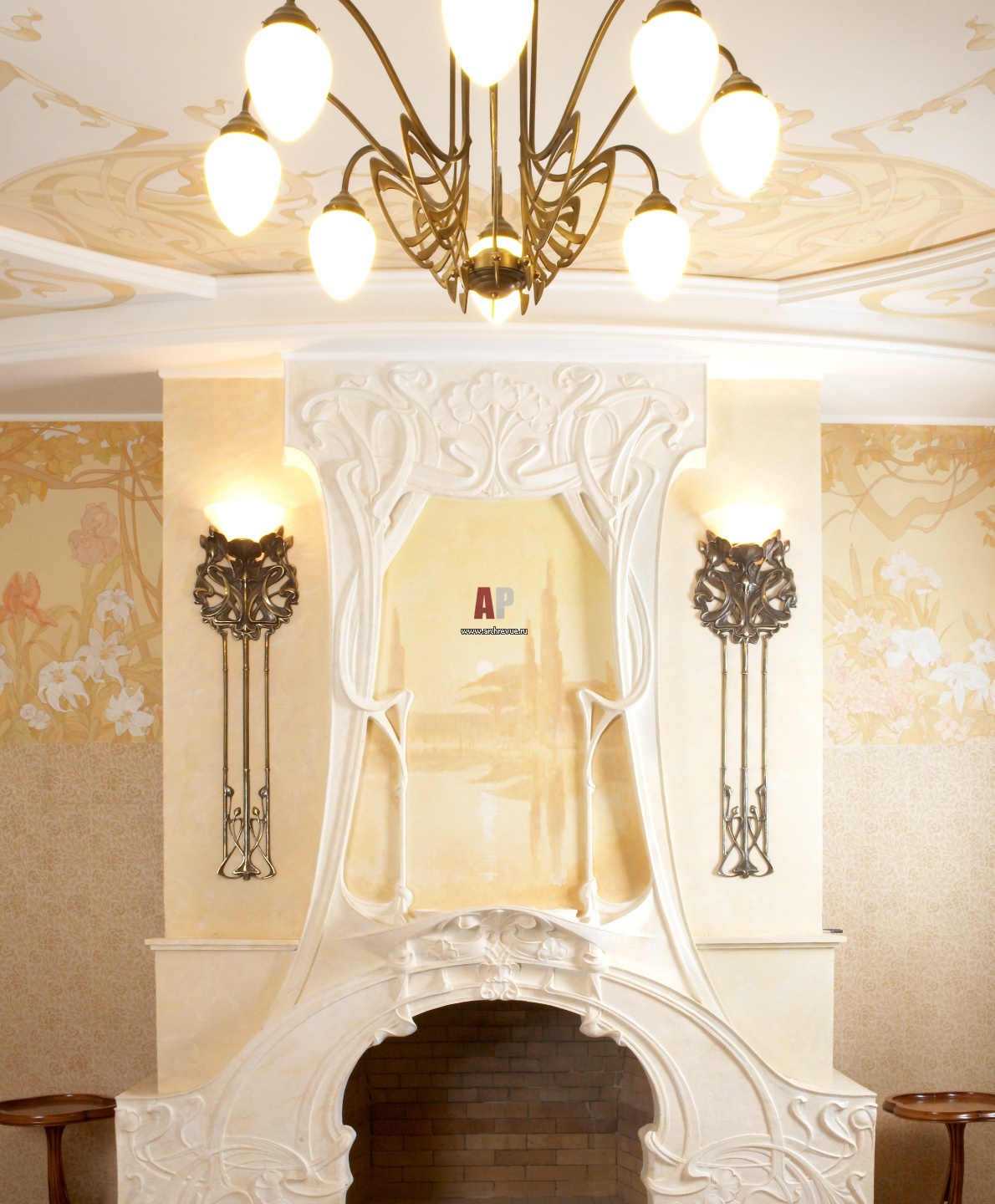 Камин изготовлен из цельного куска мрамора и оформлен ажурной резьбой, изготовление Дизайн-студия «Оринянский». Его декор рифмуется с пластикой люстры Berliner Messinglampen.