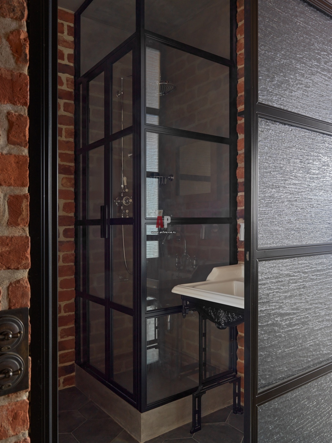 Хозяйская ванная комната. От прихожей помещение отделяет лофтовая перегородка из черного металла и рифленого стекла. Душевая оформлена тонированным стеклом. Ретровыключатели, «Гусевъ».