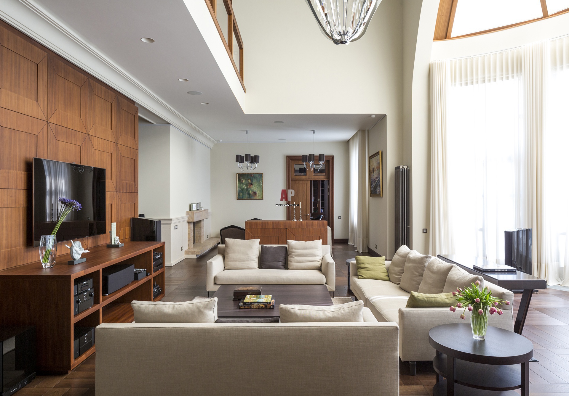 Интерьер гостиной решен на контрасте светлых окрашенных стен с бархатной фактурой и темных полов из массива ореха.