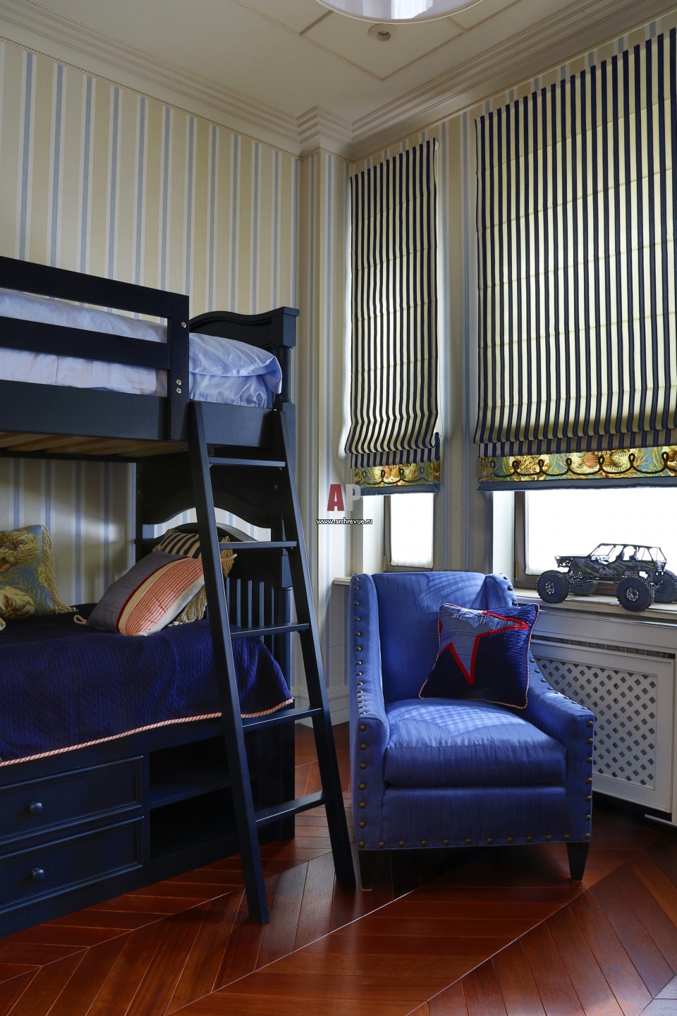 Интерьер синей детской для мальчиков. Двухэтажная кровать в комнате позволяет рационально использовать пространство.