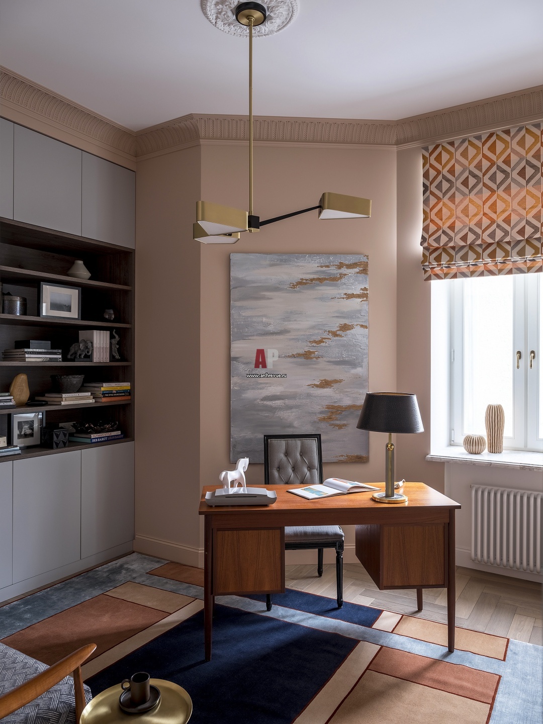 Стены кабинета выкрашены в теплый персиково-розовый цвет. Письменный стол и лампа на нем, винтаж. Стул, Eichholtz. Корпусная мебель сделана на заказ. Классические лепные карнизы и потолочная розетка прекрасно сочетаются с люстрой из латуни в стиле mid century.