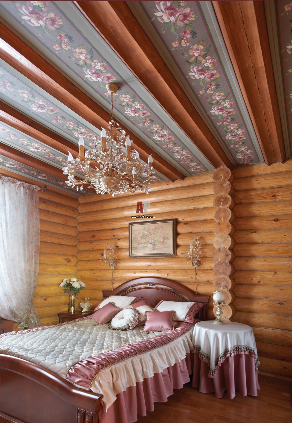 Фото интерьера спальни с элементами кантри. Гипоскартонная подшивка потолка украшена обоями с цветочным рисунком, использован декоративный бордюр. Края панелей закрыты тонким штапиком.