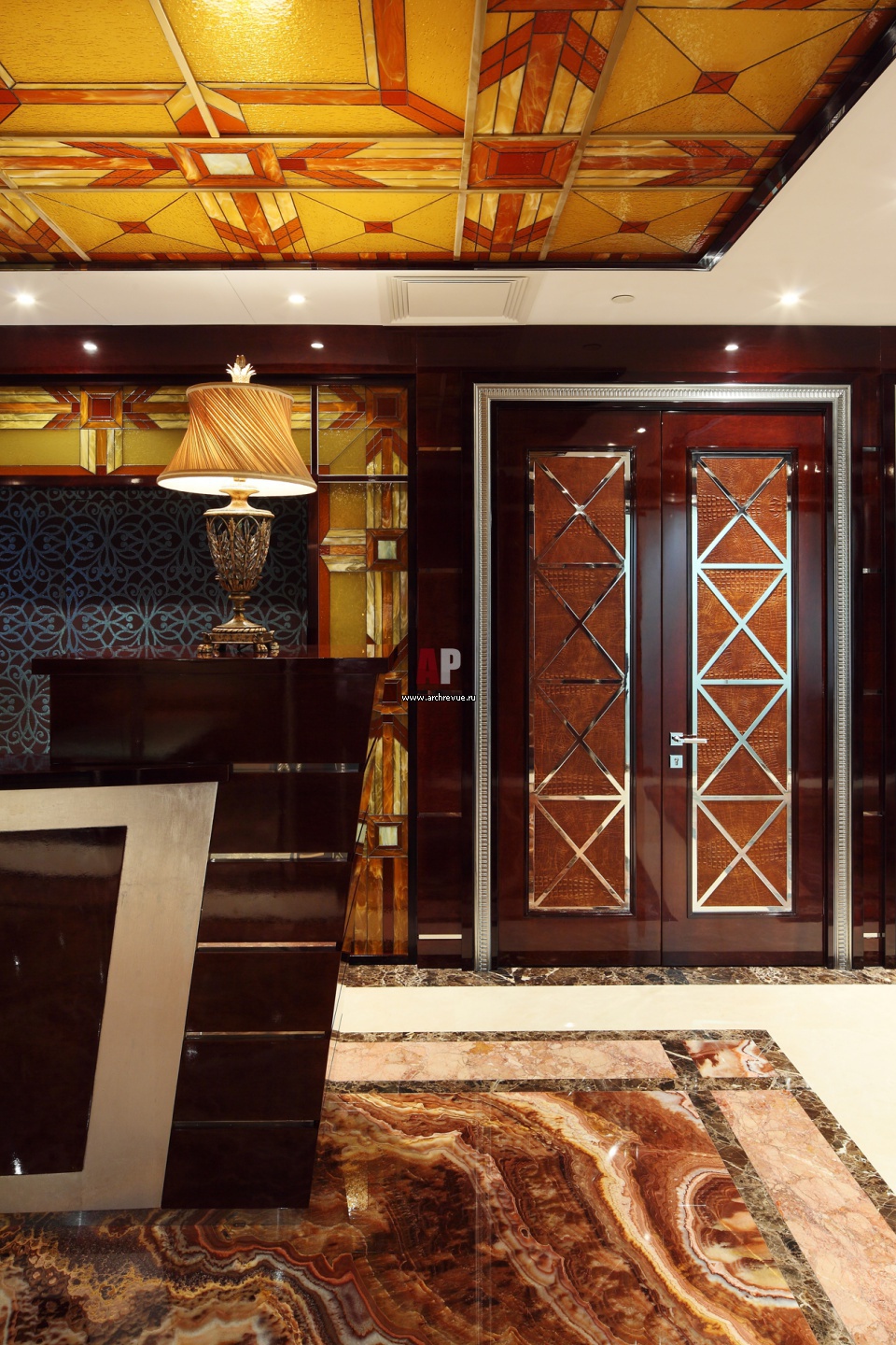 Серебристый кант на фасаде стойки ресепшен – декоративная роспись с применением сусального серебра. Над ней работали мастера компании «Мастер иллюзий». Двери оформлены кожаными вставками и отделаны раскладкой из нержавеющей стали.