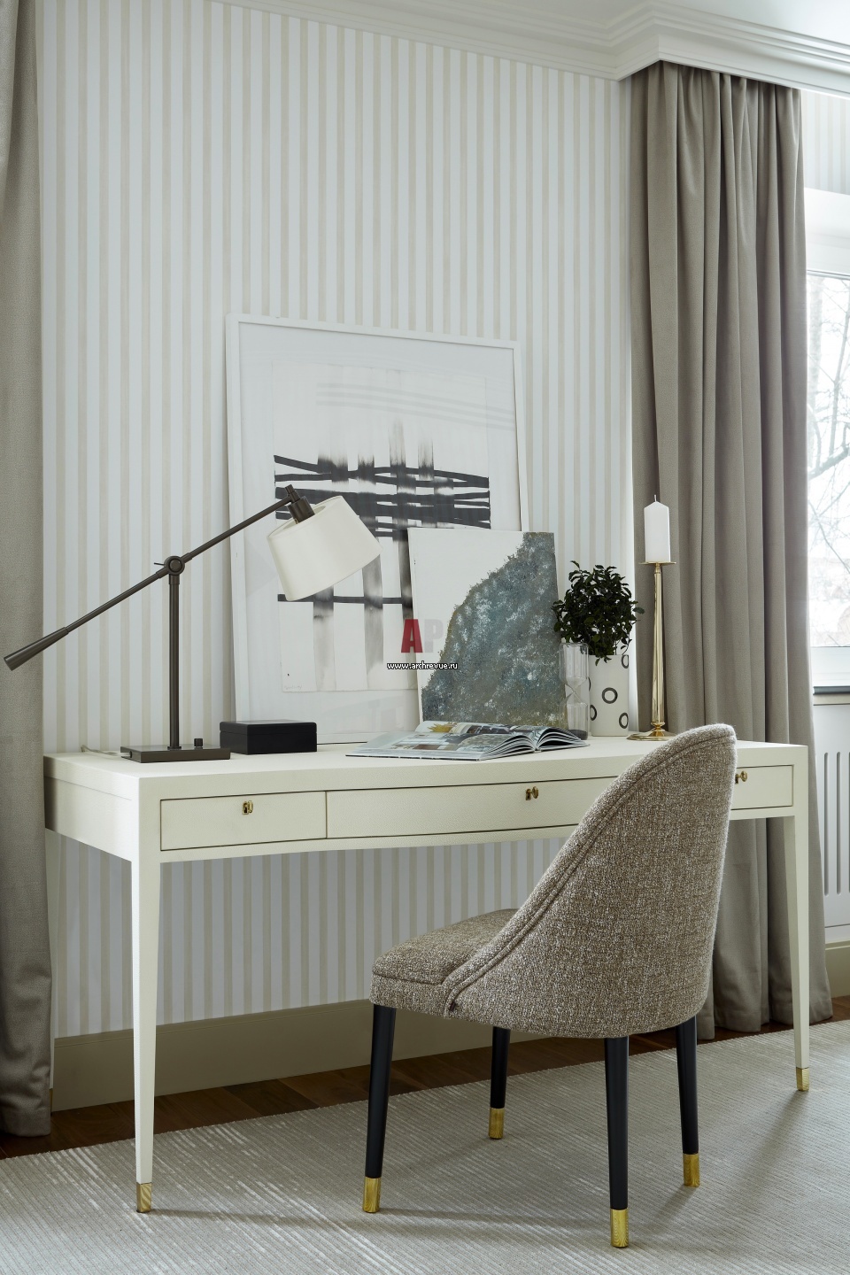 Интерьер кабинета. Белый письменный стол с латунными накладкам на ножках, Century Furniture. Светильник, Robert Abbey. Аксессуары, Global Views.