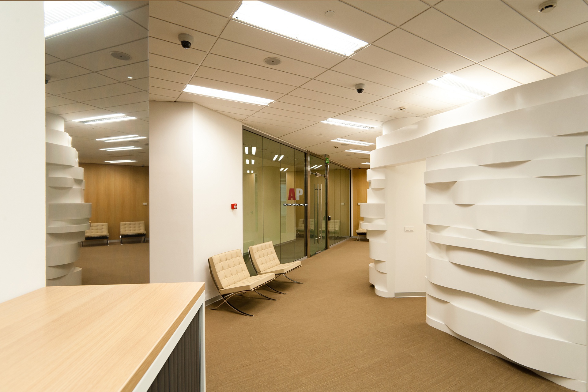 Интерьер приемной офиса. Скульптурный объем существует как бы автономно, поэтому его стенки не стали продлять до потолка. Коммуникации, спускающиеся с потолка, скрыты от взглядов за зеркалами.