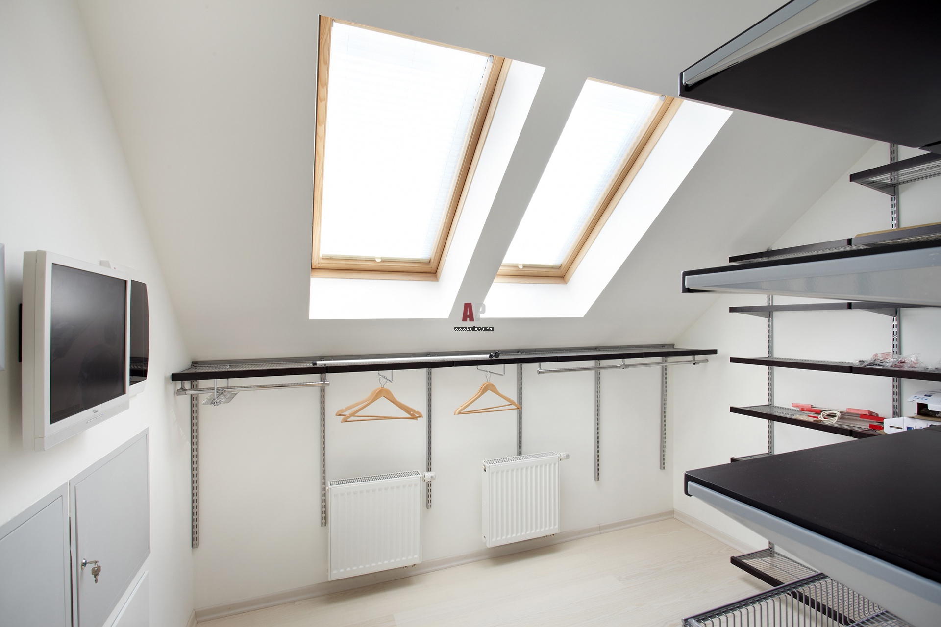 Дизайн интерьера гардеробной в доме. Большая гардеробная расположена на втором этаже, она примыкает к хозяйской спальне и освещается двумя мансардными окнами. Поставщик мансардных окон – VELUX
