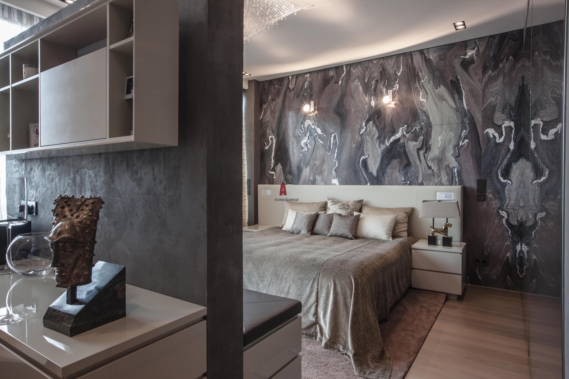 Стена за изголовьем кровати в родительской спальне облицована мрамором серого цвета. Кровать, Treca Interiors Paris.