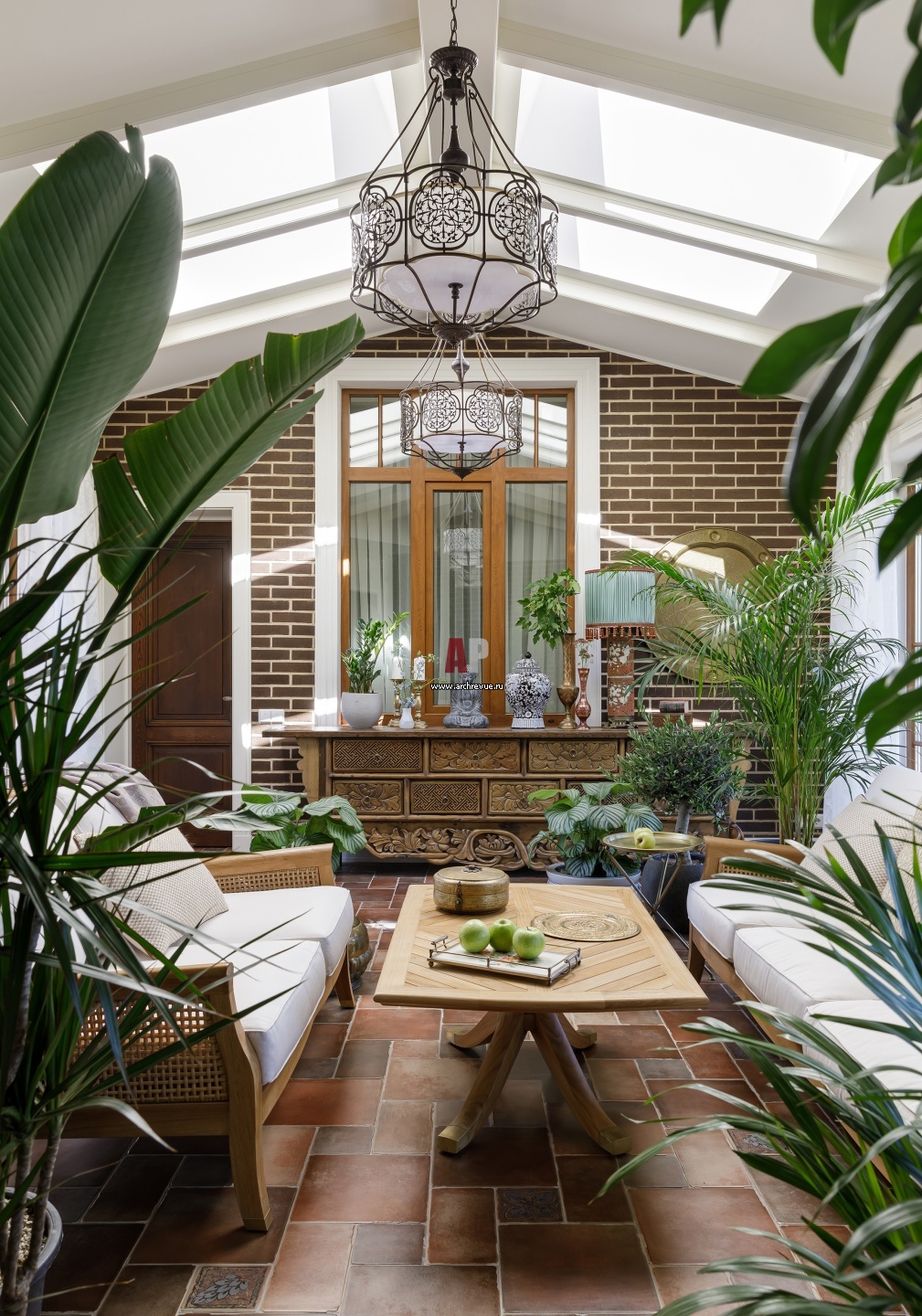 Зона отдыха в зимнем саду. К ней примыкает домашний СПА-комплекс с хаммамом и сауной. Резной комод в этническом стиле, антиквариат.