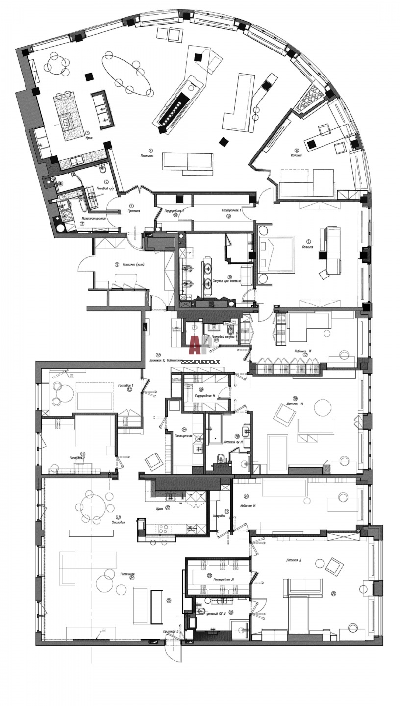 Объединена квартир. План дуплекса для семьи с двумя детьми. Общая площадь – 596 кв. м.
