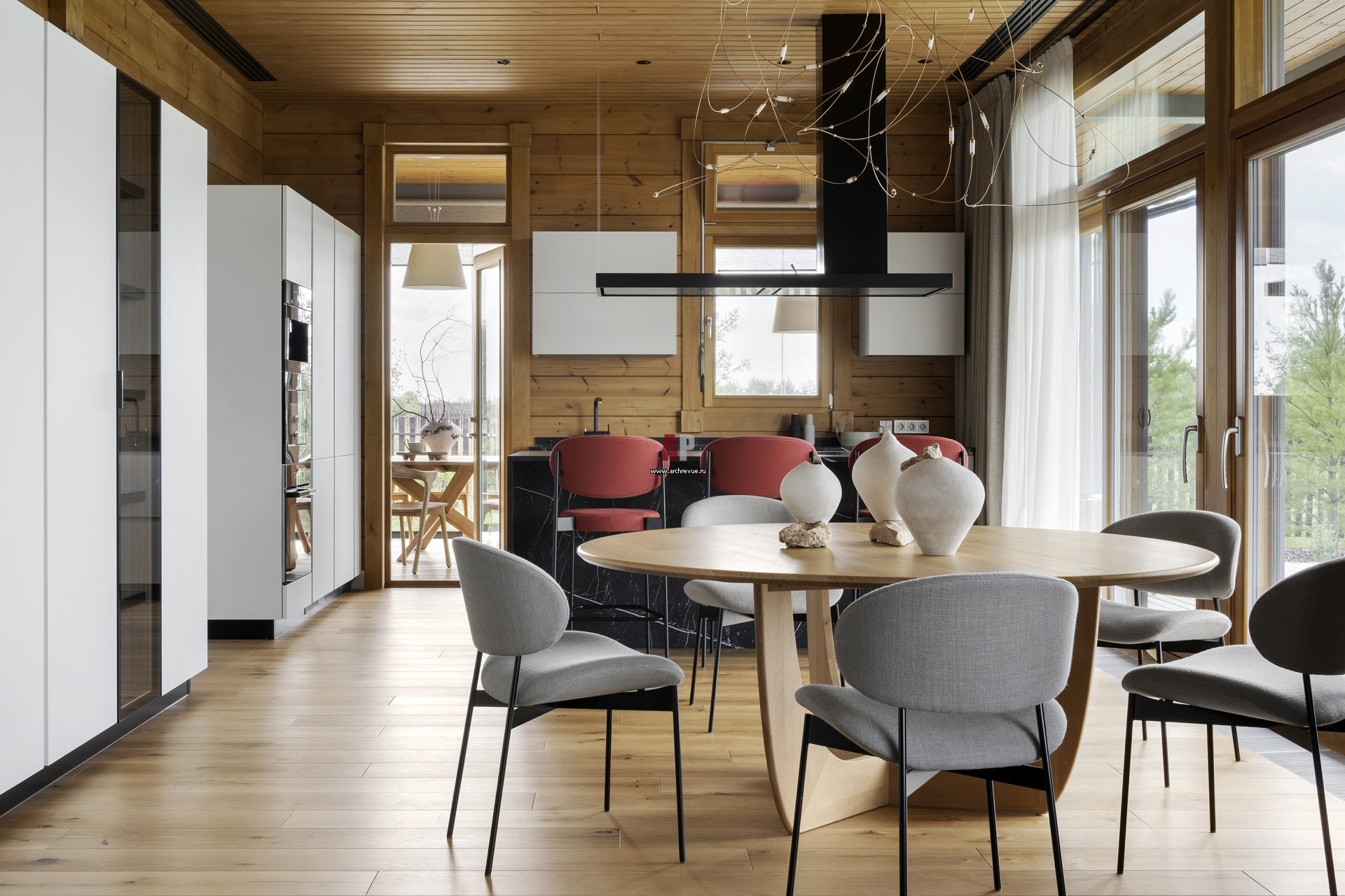 Кухня. Высокие колонны для бытовой техники и хранения посуды выстроены в единую линию, так чтобы они не просматривались из гостиной. Технический свет, IGuzzini.