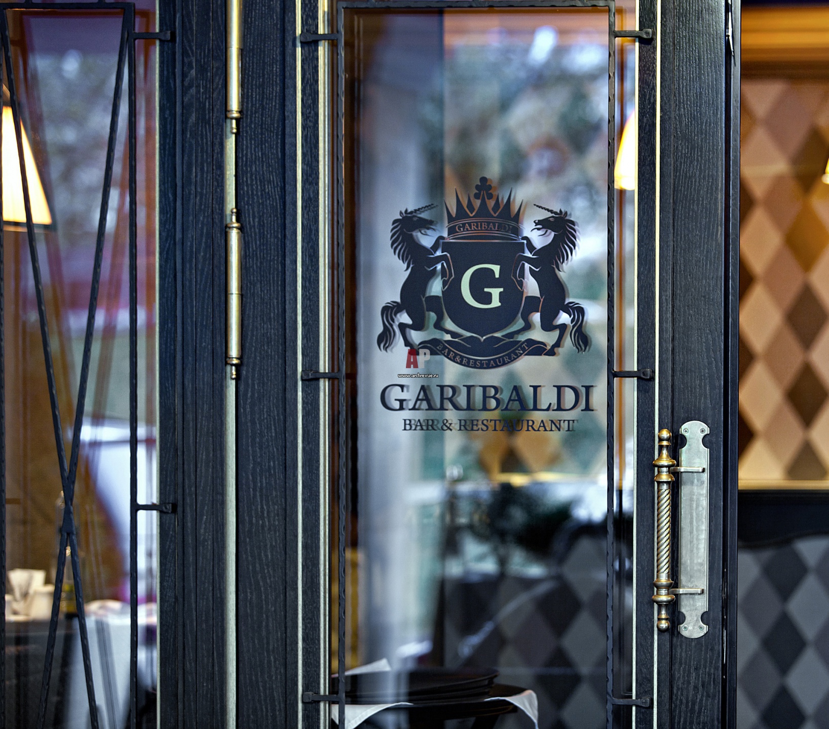 Входная группа ресторана. Входная дверь выполнена на заказ из тонированного дуба, на стекло нанесен логотип ресторана. Дверная ручка – бронза с патиной.