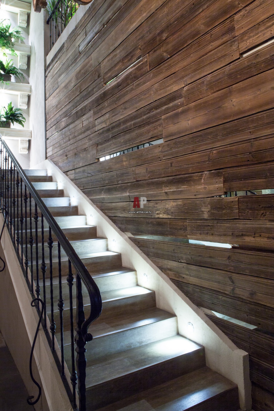 Три этажа ресторана объединяет лестница с легким кованым ограждением. Чтобы зрительно расширить лестничный холл, стены были зашиты старинной деревянной доской ХIX века со вставками из зеркал.