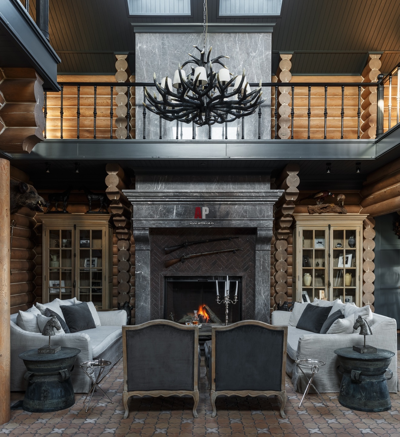 Интерьер двухэтажного коттеджа «Уткино Country House». Мозаичный пол из терракотовой плитки, Alteret Ceramicas. Мебель, люстра с рогами, Restoration Hardware.