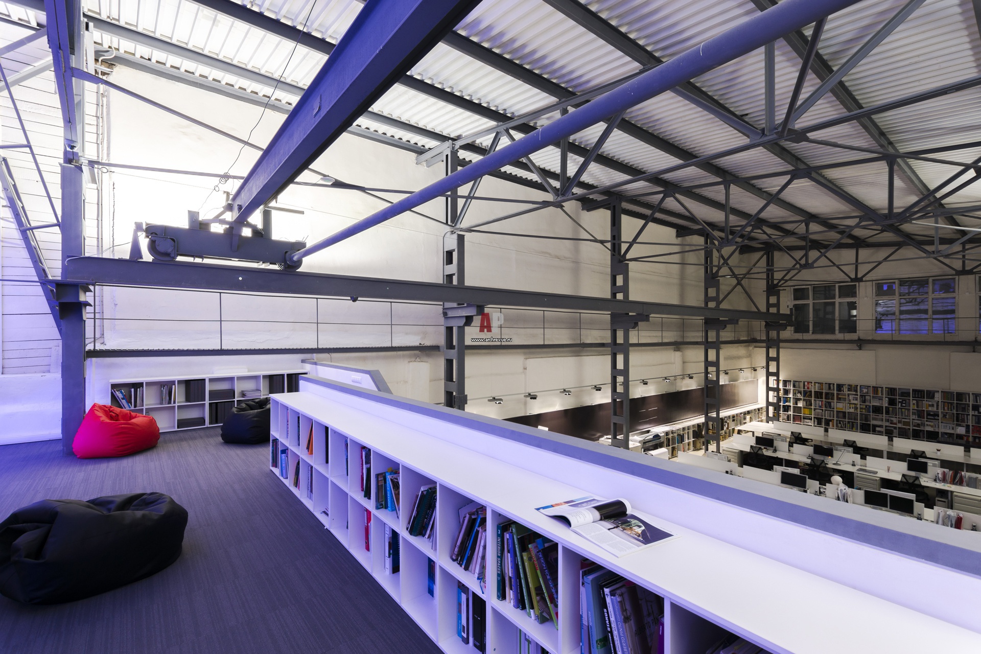 На антресольном этаже находится зона отдыха и библиотека. Здесь проводятся учебные тренинги и семинары. Одна из стен оборудована акцентной цветодинамической подсветкой, с помощью которой можно менять настроение пространства.