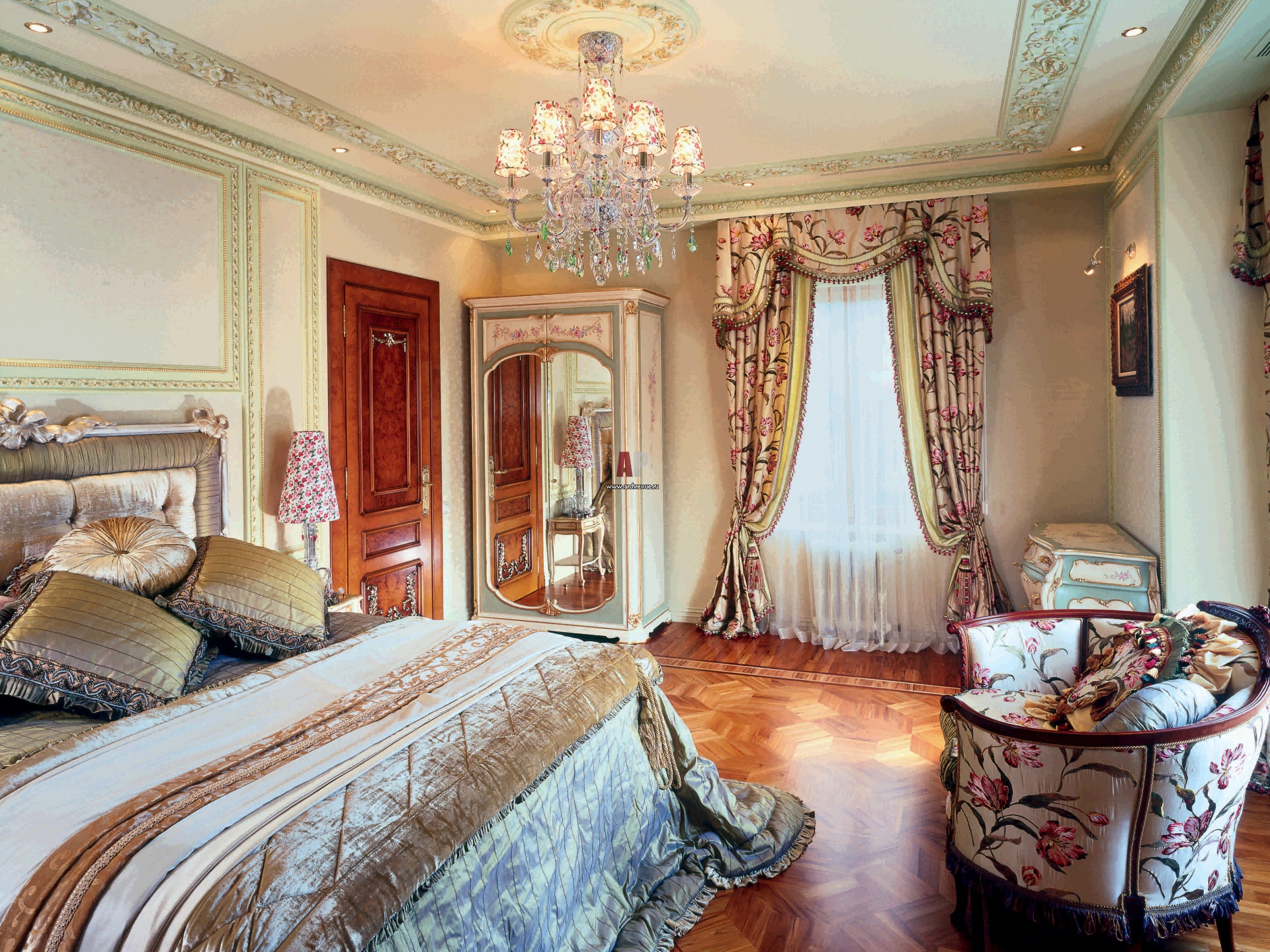 Детская спальня оформлена в парадном классическом стиле. Потолок украшен лепным карнизом из цветов. Кровать, Jumbo.