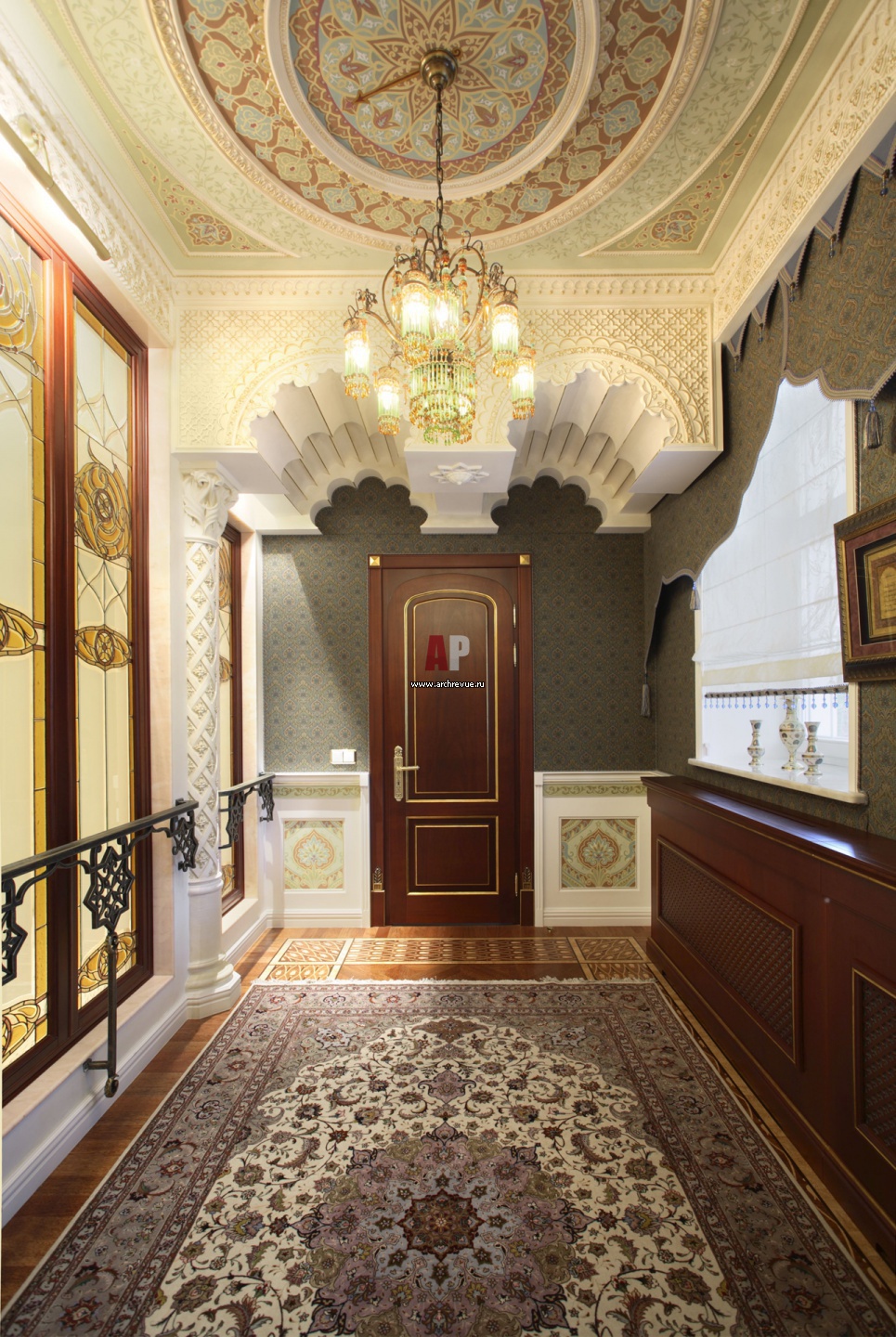 Коридор второго этажа с этническими мотивами. Лепнина в стиле интерьеров махараджей с росписью и позолотой. Изготовление, «Мастерская Александра Феряева».