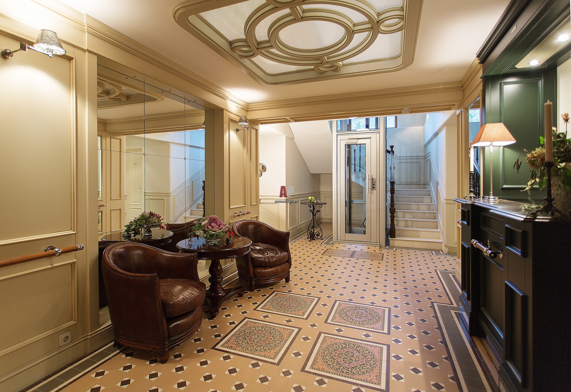 Интерьер зоны ресепшен выполнен в английском стиле. Низкие потолки визуально «поднимает» световой фонарь. На полу – панно из английской плитки Original Style, поставщик «Интерьерный салон».
