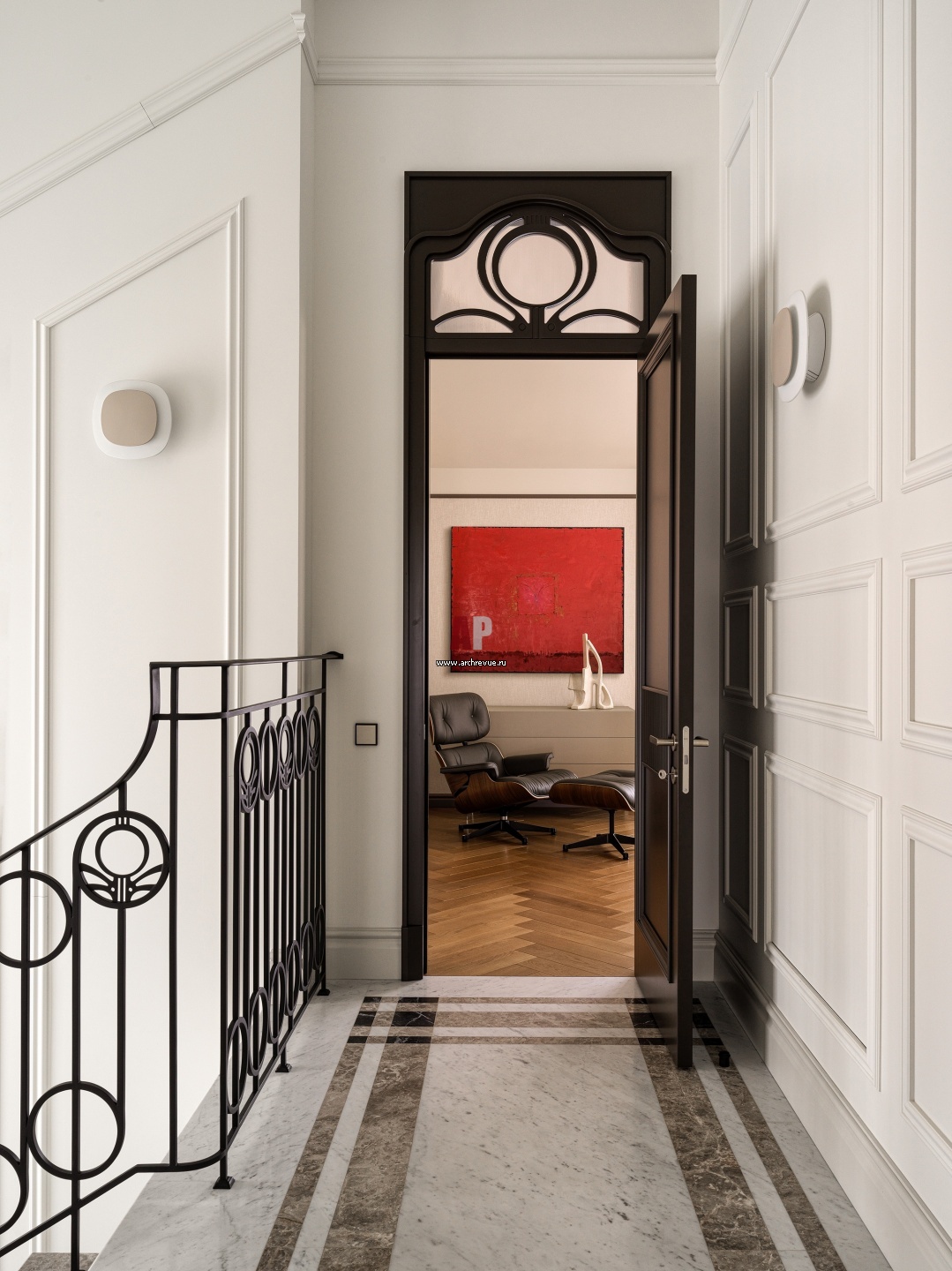 Холл второго этажа с лестницей. Ограждение лестницы и портал двери украшены стилизованными медальонами.