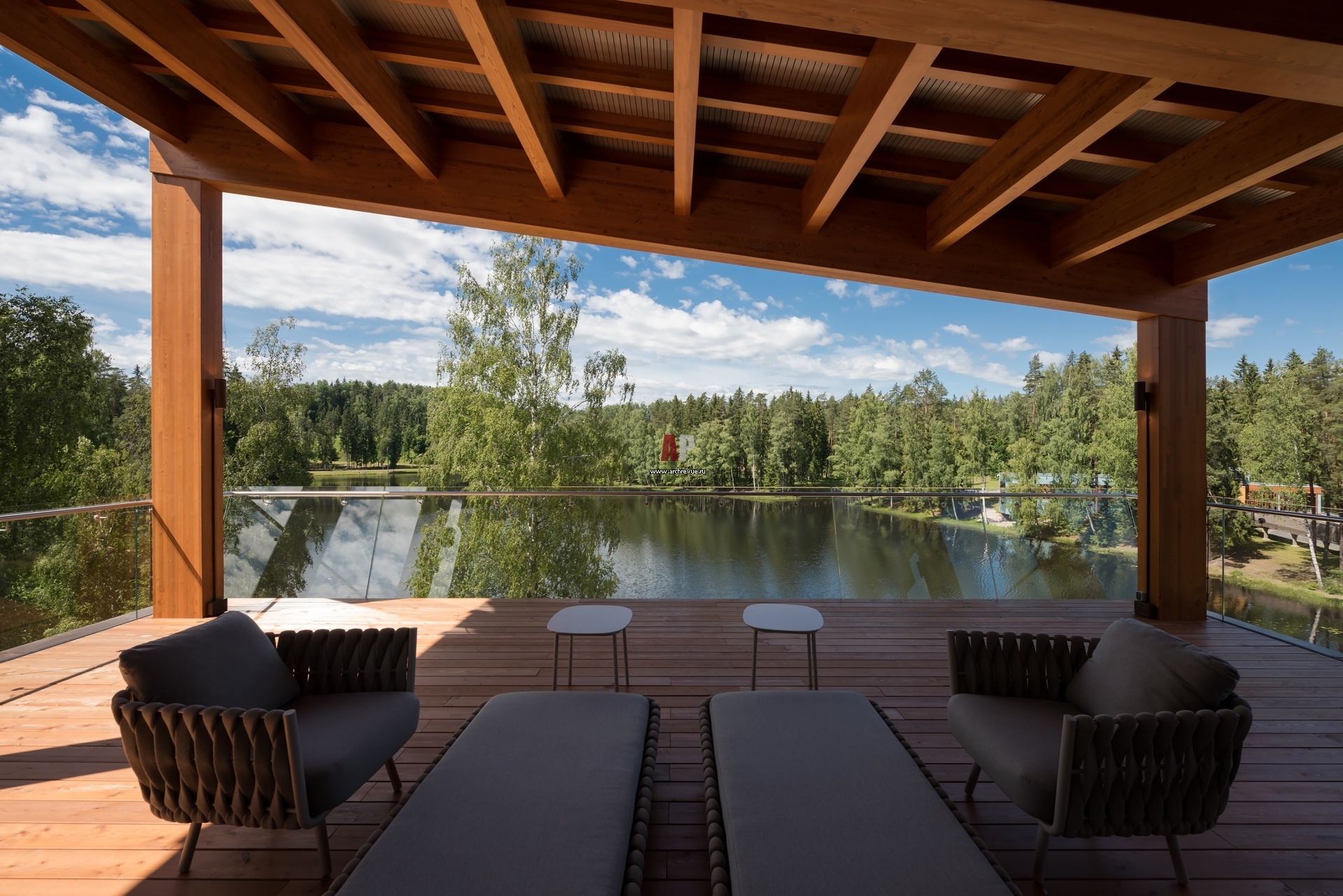 Дом имеет панорамное остекление, поэтому его интерьеры выглядят как продолжение природного ландшафта заповедного места.