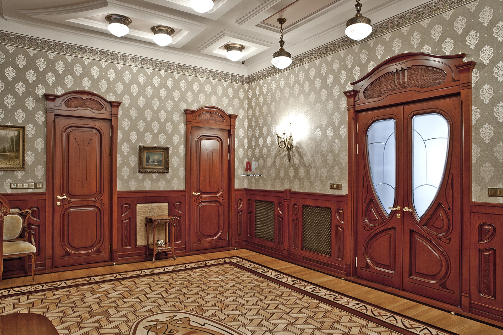 Нижняя часть стен зашита панелями-буазери с кожаными вставками, двери выполнены из древесины вишни – изготовление «АФ Ника».