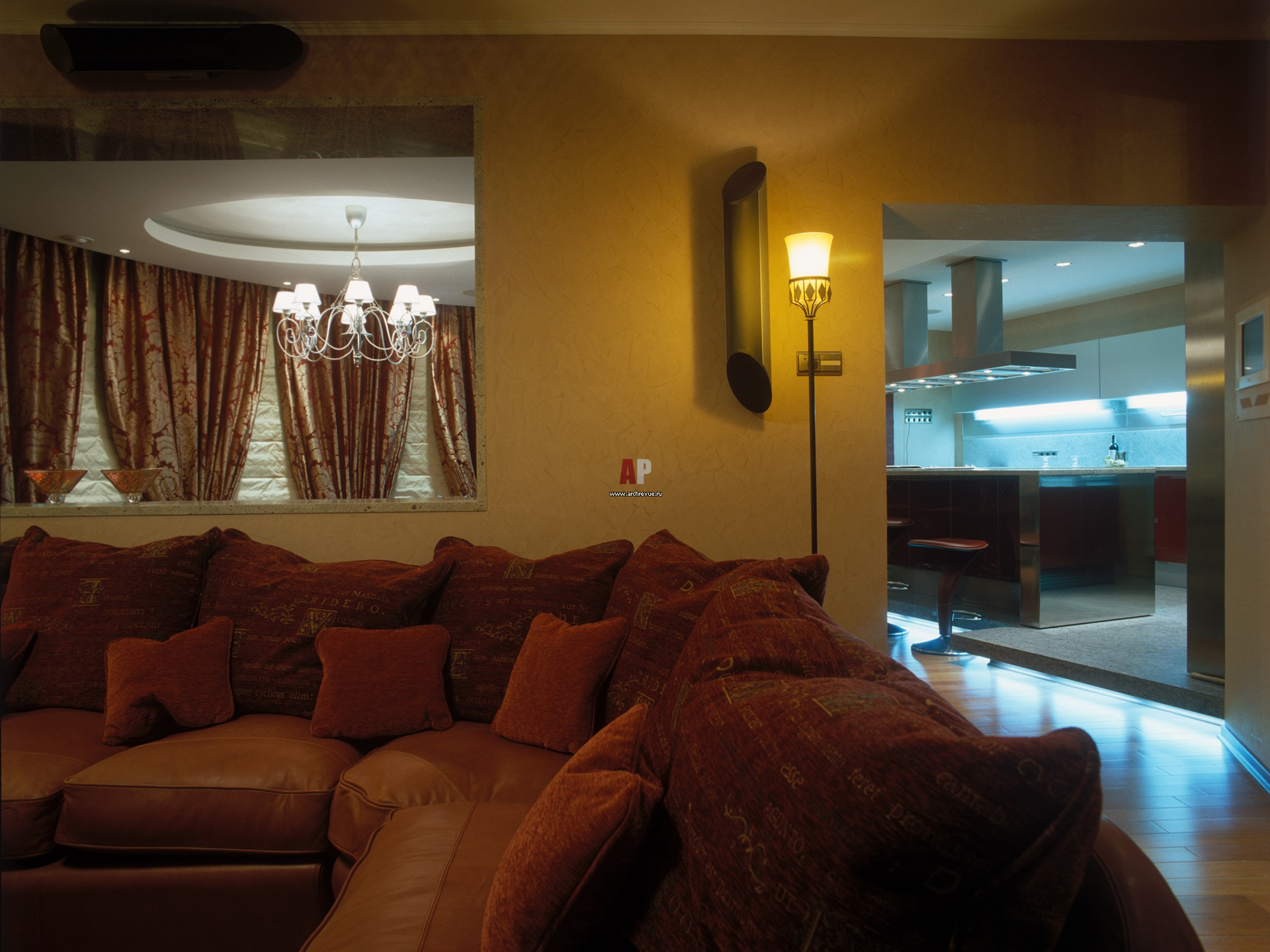 Оформляя гостиную с зоной домашнего кинотеатра, авторы организовали оконный проем, отделанный мрамором, что позволило смотреть ТВ и из столовой.