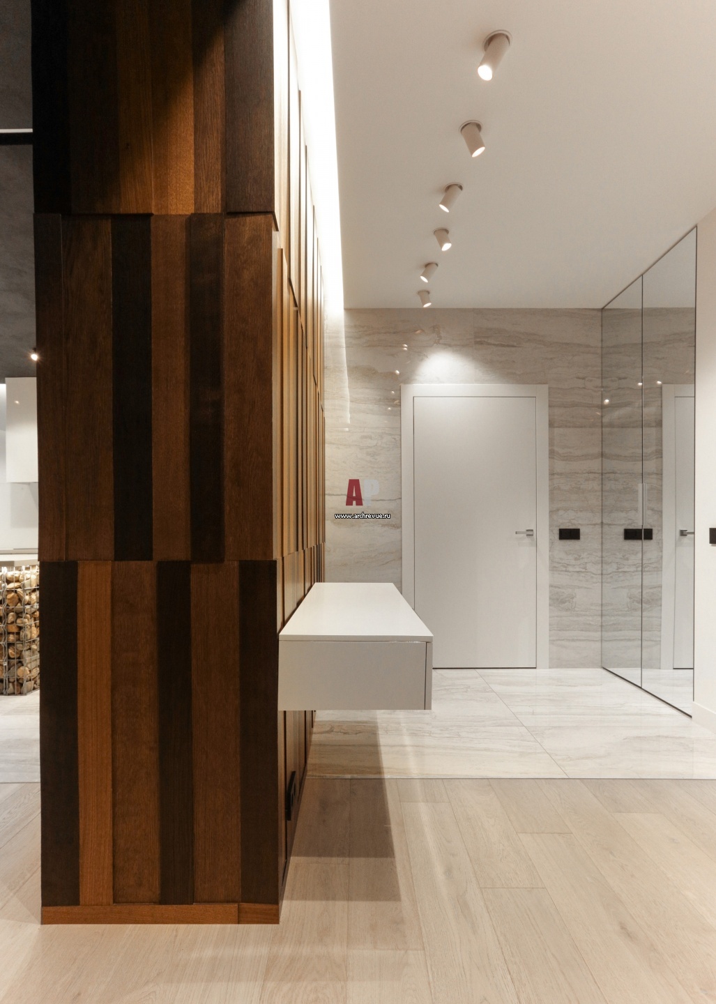 Прихожая отделена перегородкой, отделанной тонированными вертикальными дубовыми панелями. Напротив – встроенный шкаф с зеркалом. На полу – керамогранит с нейтральной фактурой камня.
