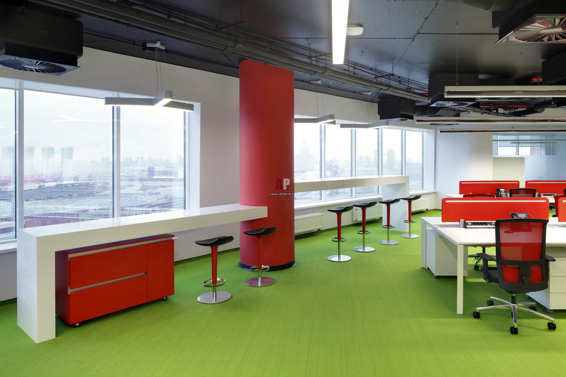 В зоне open space помимо рабочих мест рядовых сотрудников сделаны открытые зоны для переговоров и неформального общения. Пример тому – стойка из кориана вокруг колонны и длинная стойка вдоль окна.