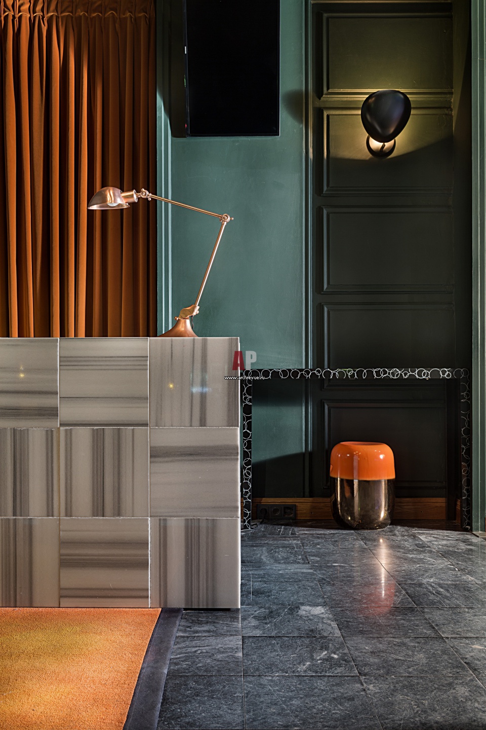 Входная зона со стойкой хостес. Стойка облицована каменными плитами с геометричной раскладкой.