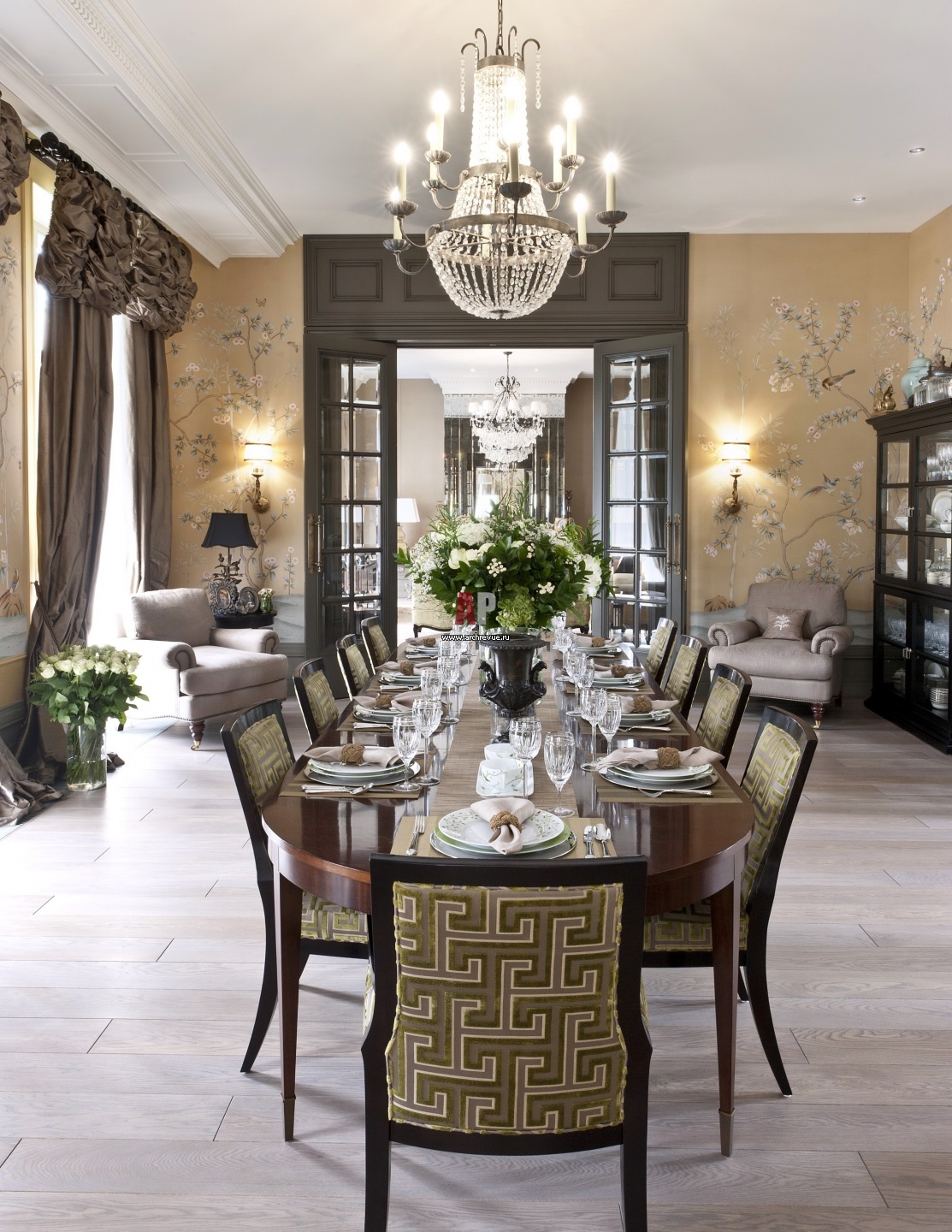 Интерьер китайской столовой. Люстра, Visual Comfort & Co. Стулья Baker. Кресла, Lillian August. Витрины, Century Furniture.