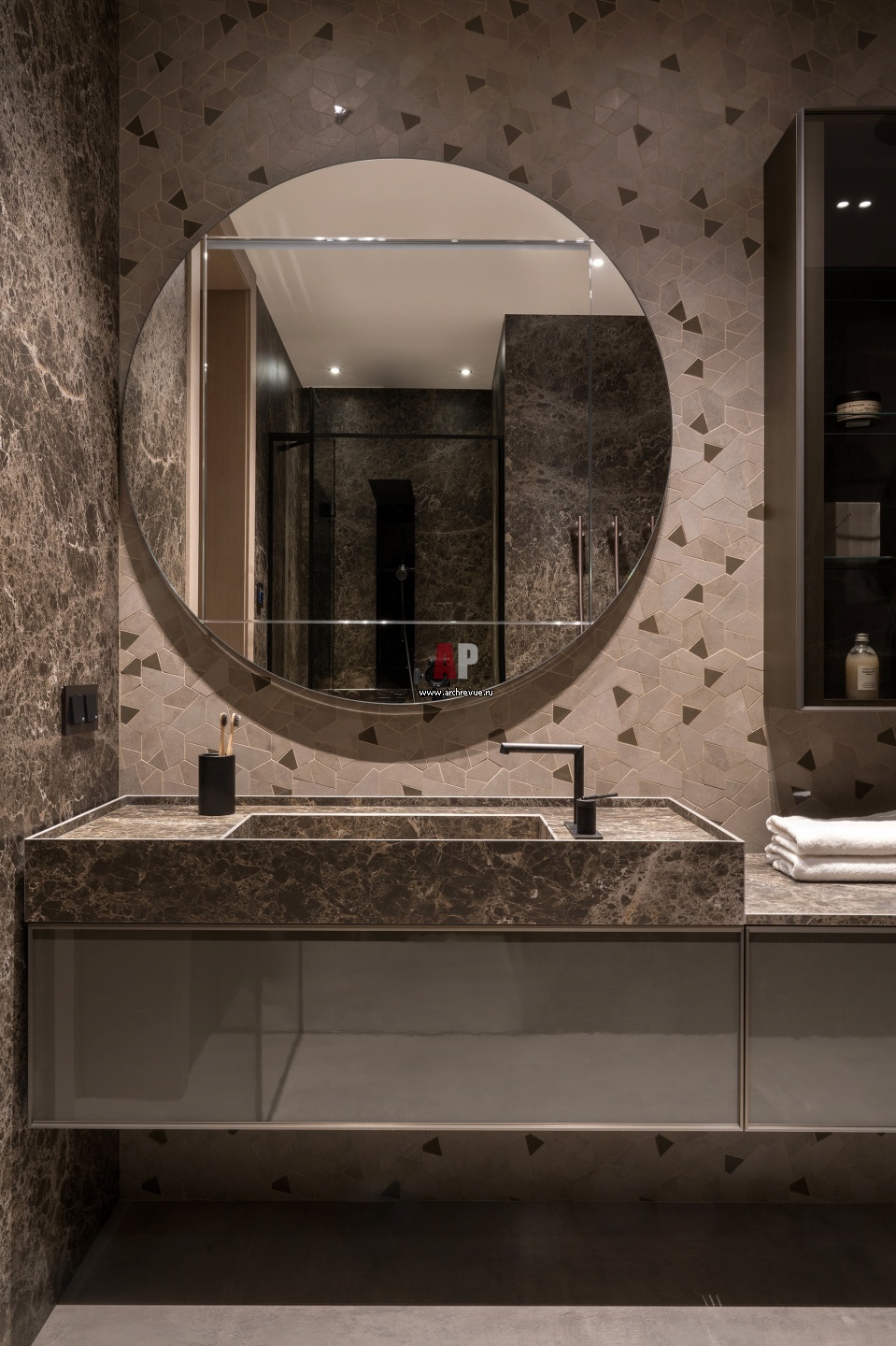 Ванная комната при спальне сына. Мебель, Novello. Раковина изготовлена из керамогранита Laminam. Им же облицованы стены. Стена за умывальником оформлена мозаикой, Atlas Concorde.