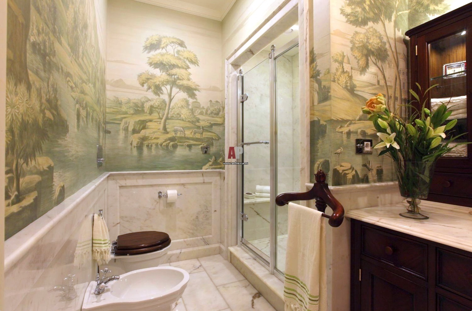 Ванная комната при хозяйской спальне. Стены оформлены буазери из мрамора и росписями в венецианской технике. Мебель для ванной изготовлена на заказ из массива дерева со светлой эмалью.