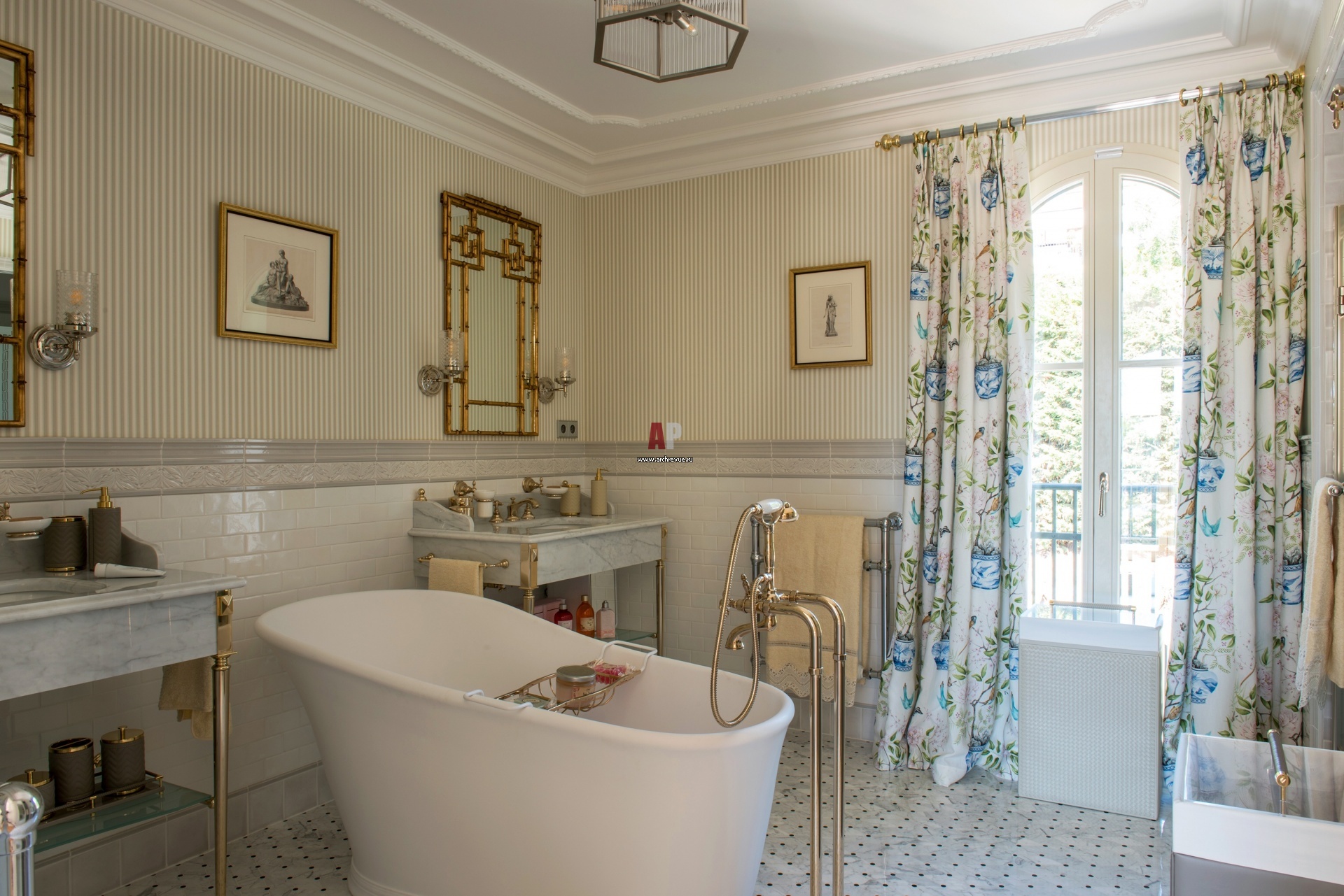 Хозяйская ванная комната с двумя раковинами и отдельно стоящей ванной. Шторы с крупным цветочным узором рифмуются с оформлением смежной спальни. Ванна и раковины в классическом стиле, Imperial Bathrooms.
