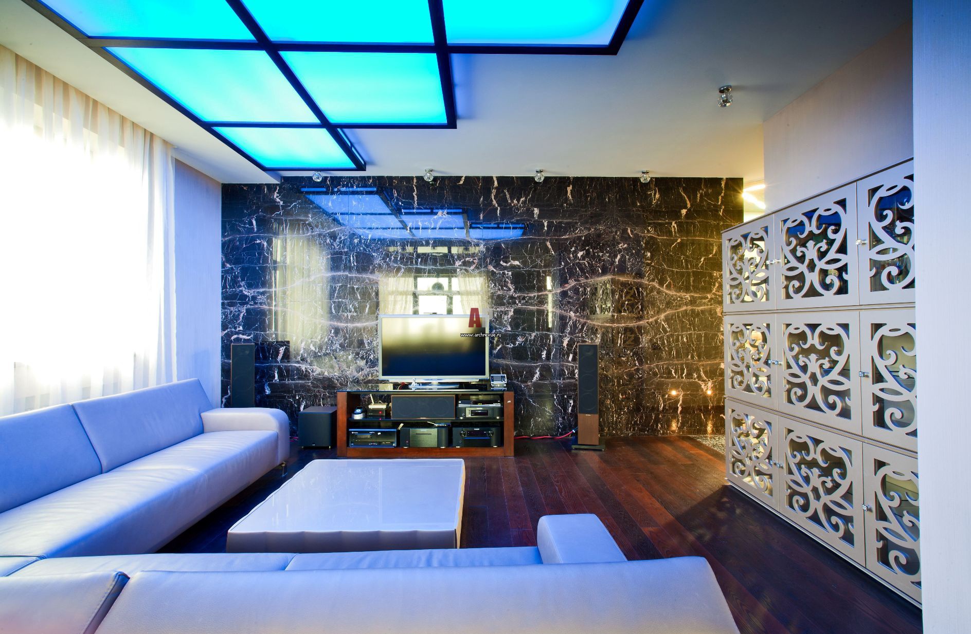 Акцент гостиной – стена, облицованная мрамором. 4 слэба размером 1Х1,5 метра выглядят как единое целое благодаря шлифовке, поставщик «Империя каминов ». Световой фонарь над диваном выполнен из пластиковых панелей по чертежам дизайнеров. Он может менять цвет от комфортного дневного до неонового клубного.