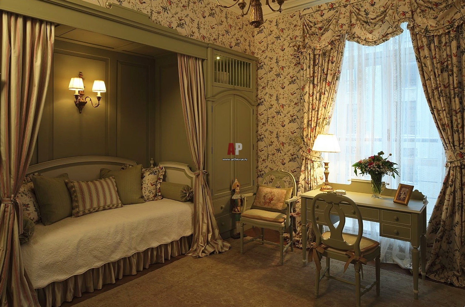 Спальня младшей дочери. Кровать встроена в нишу-альков. С другой стороны от него находится ниши библиотеки спальни старшей дочери. Такой прием позволил увеличить скромные размеры обеих детских. Обои горчичного цвета с цветочным орнаментом, Cole & Son.