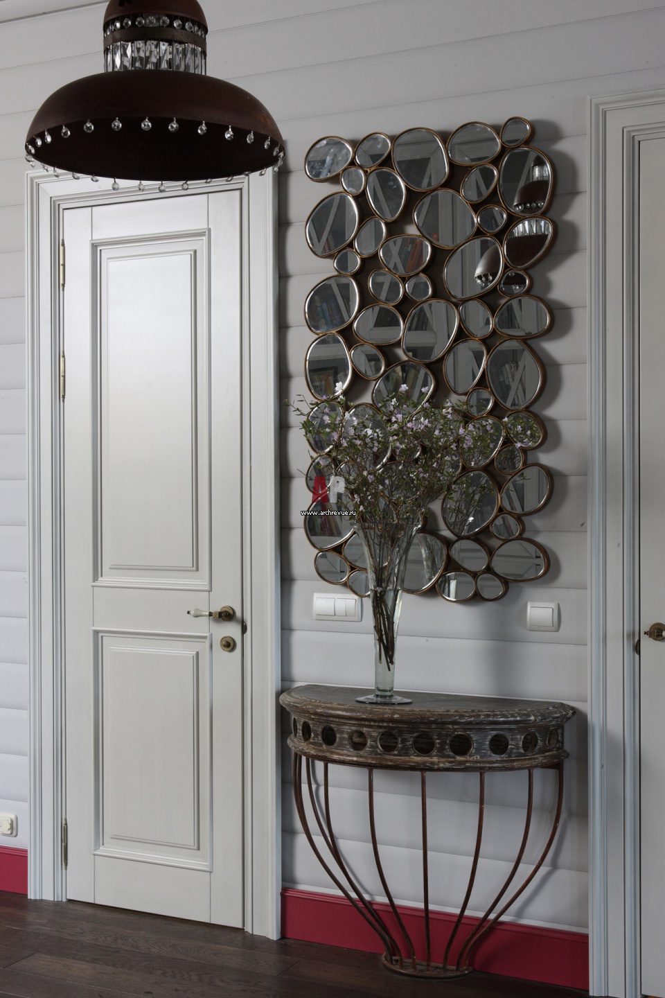 Фрагмент холла. Двери были куплены до момента прихода на объект декоратора. Чтобы их облагородить, автор проекта выкрасила их в белый цвет. Высокие плинтуса в холле и гостиной – цвета фуксии.
