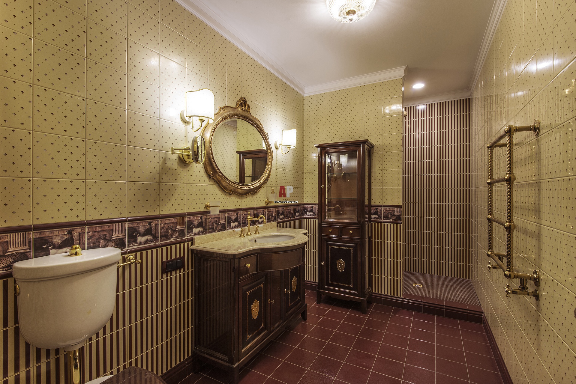 Фото интерьера мужского санузла в английском стиле. На стенах – английская глазурованная керамика коньячно-кремового цвета. Декоративный бордюр с изображением гончих.