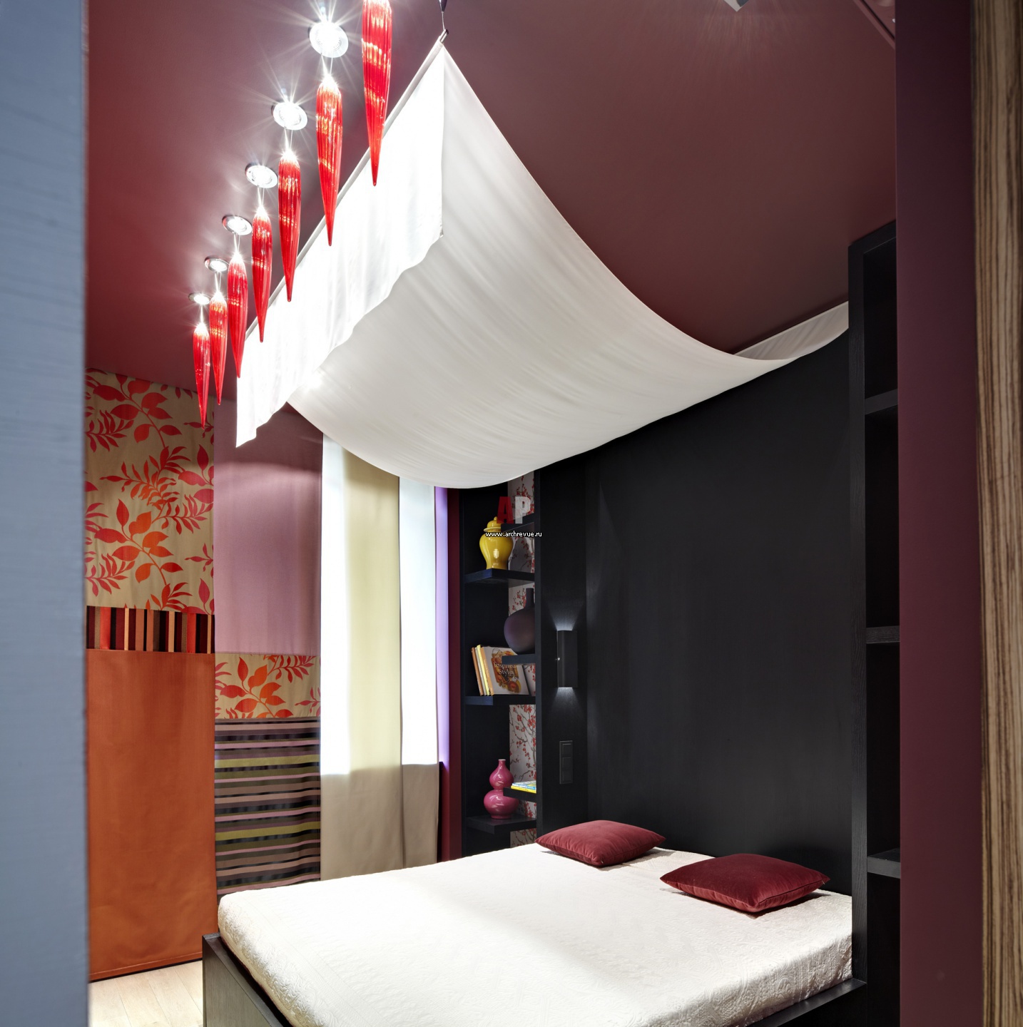 Небольшая гостевая спальня вишневого цвета в восточном стиле. Кровать с балдахином и деревянным изголовьем – сделана на заказ, изготовление Monbelier. Светильники, Axo Light.