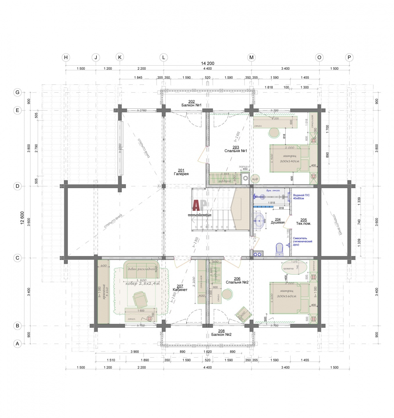 План второго этажа двухэтажного деревянного дома для постоянного проживания. Общая площадь - 234 кв. м.
