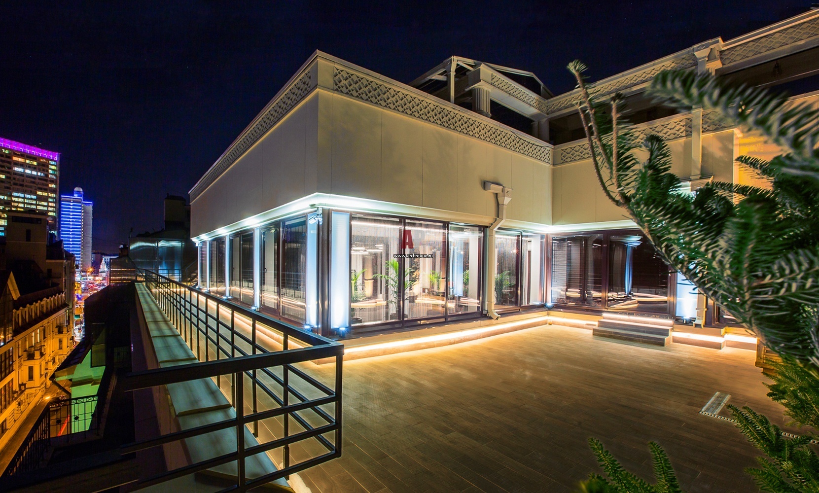 Двухэтажный пентхаус с террасой. Подсветка на террасе включает 10 настенных светильников и всепогодные герметичные светодиодные светильники.