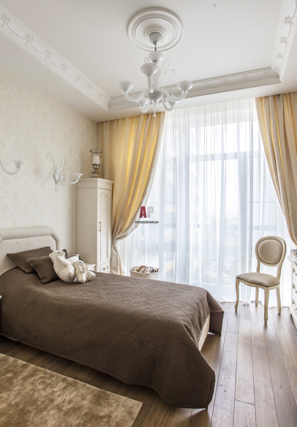 Дизайн интерьера детской в стиле неоклассика с панорамным окном. Потолок украшен лепным карнизом.