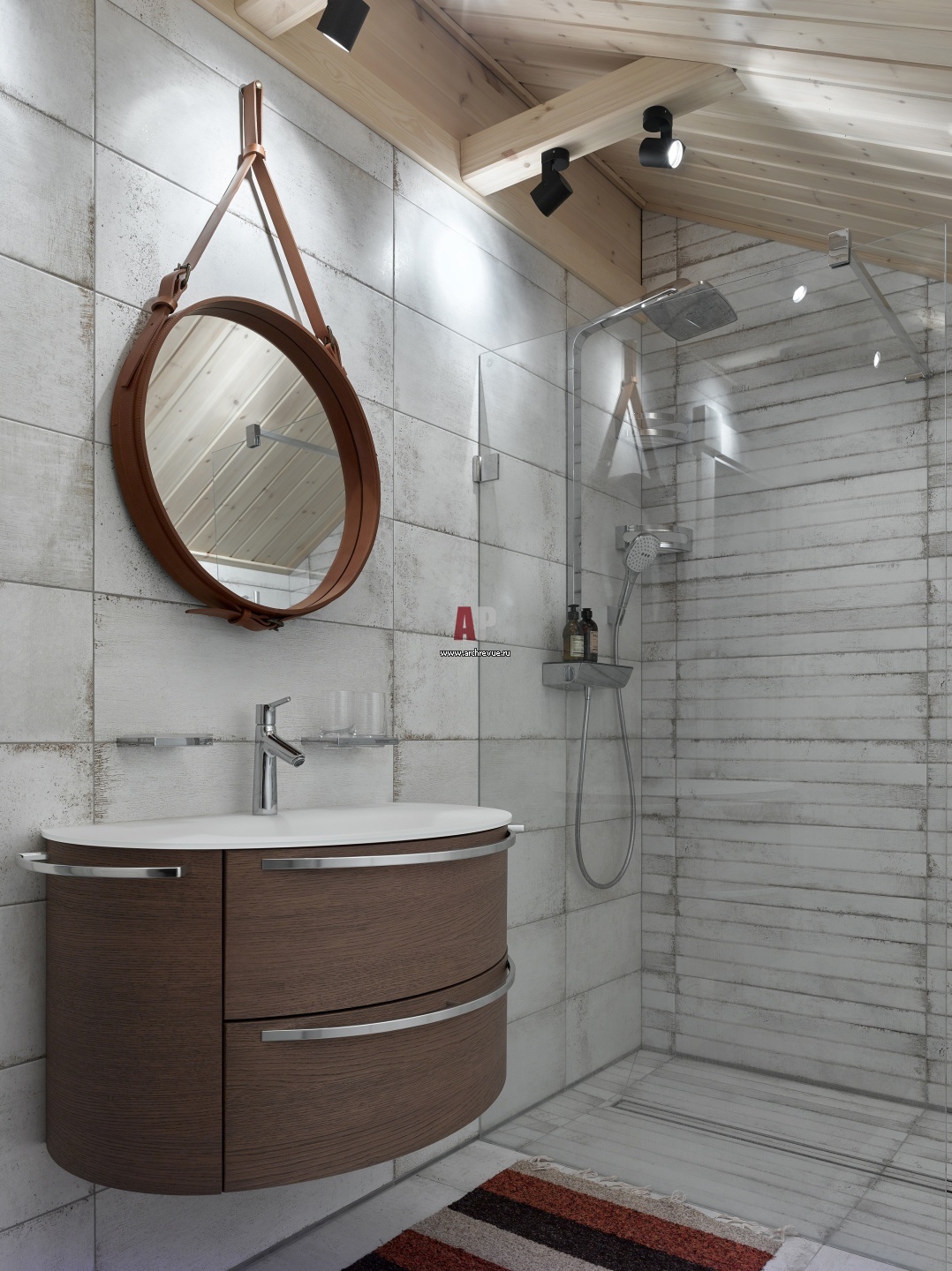 Санузел на втором этаже. Плитка, Peronda и Ceramica Bardelli. Сантехника, Laufen и Hueppe. Свет, Arteriors.