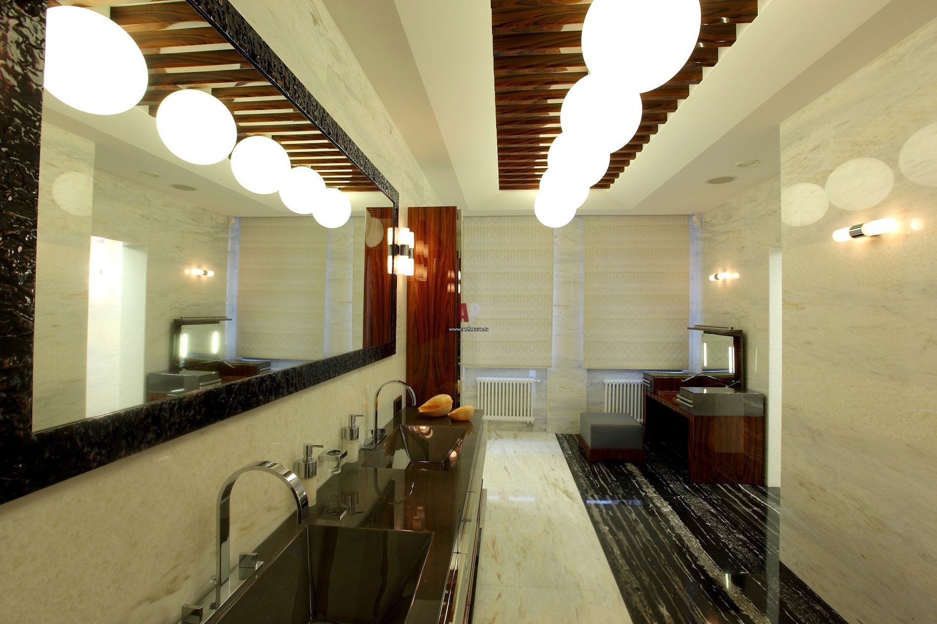 В хозяйском санузле потолочные балки выполнены из палисандра, производство «АФ Ника».