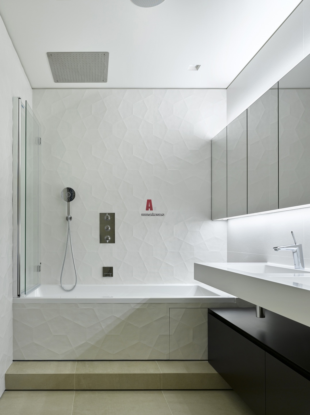 Белая ванная комната выглядит легко и воздушно. Стена и фасад ванны оформлены плиткой с рельефной фактурой, напоминающей мятую бумагу.