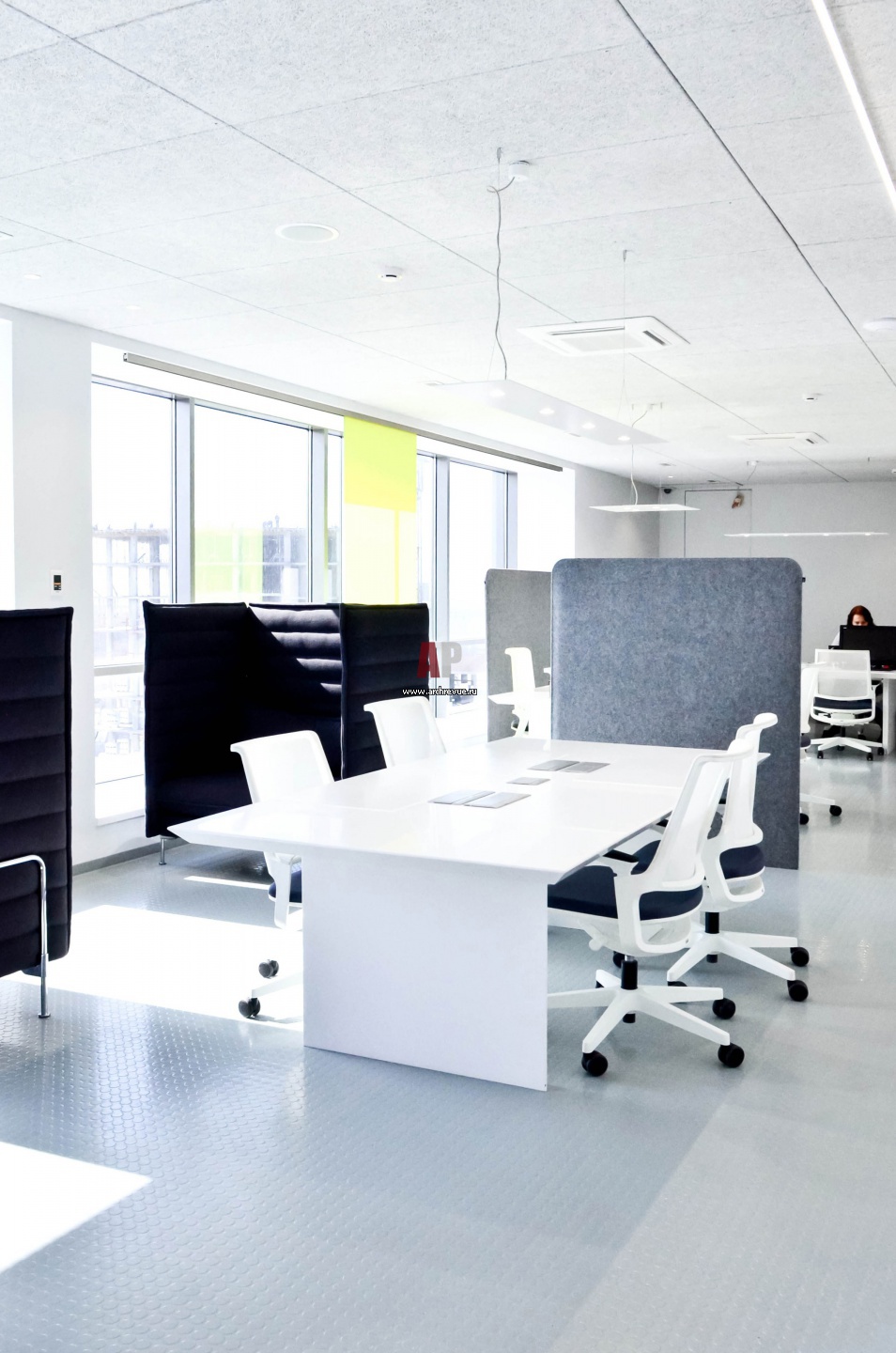 Дизайн рабочего open space обусловлен созданием комфортных условий для командной работы. Большие столы позволяют работать с крупными графическими и текстовыми материалами. Между рабочими станциями организовано общее лаундж-пространство для коммуникации, которое визуально разграничивает рабочие группы. Вся мебель сделана по чертежам архитекторов.