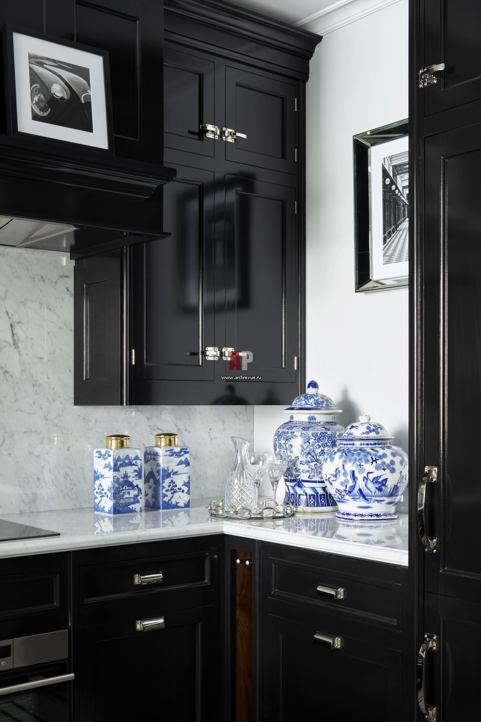 Монохромный интерьер кухни строится на контрасте темного гарнитура и светлого камня в отделке стен и столешницы.