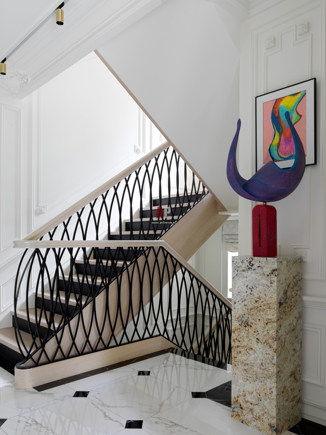 Дом с парижским шиком. Холл. Лестница с черными подступенками сделана на производстве Finex. Перила изготовлены по эскизам дизайнера на производстве металлопроката.