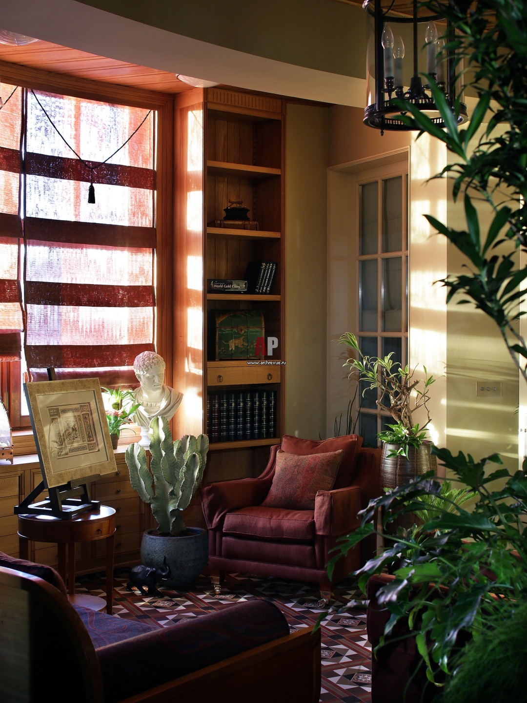 Зона отдыха в кабинете. В полукруглую стену встроены стеллажи для книг. Обилие живой зелени создают атмосферу загородного дома.