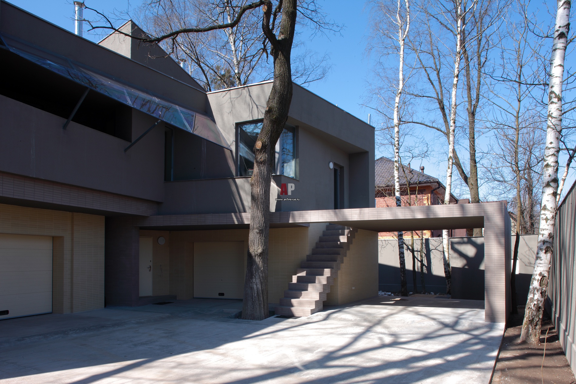 В доме два автономных входа: для хозяев и обслуживающего персонала. Лоджия на втором этаже примыкает к хозяйскому кабинету и прикрыта от осадков стеклянным навесом на металлическом карасе. Авторы проекта Пётр Зайцев и Арсений Борисенко, бюро za bor.